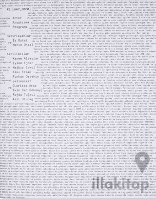 Arter Öğrenme Programı kapsamında hayata geçirilen Arter Araştırma Programı, çağdaş sanat alanında çalışan kültür üreticilerinin faaliyet alanlarına dair araştırma yöntemlerini, bakış açılarını ve ifade biçimlerini geliştirmelerine destek olmayı amaçlıyor. Süreç odaklı ve kendiliğinden örgütlenmeyi önemseyen bir yaklaşımı temel alan program, katılımcıların ve program yürütücülerinin işbirliğiyle şekillendiriliyor. Arter Araştırma Programı’nın Ekim 2020–Mayıs 2021 dönemi çalışmaları kapsamında üretilen Re: [aap_2020] başlıklı kitabın içeriğini, programa katılan Kerem Altaylar, Eylem Ejder, Nejbir Erkol, Alev Ersan, Furkan Öztekin, palimpsest (Larissa Araz ve Ekin Can Göksoy), Rojda Tuğrul ve Aslı Uludağ’ın devam eden araştırmalarıyla bağlantılı katkılarının yanı sıra program kapsamında birlikte üretilen metinler oluşturuyor. Kitapta ayrıca katılımcıların araştırmaları çerçevesinde başvurdukları temel kaynakları ve program süresince gerçekleştirilen buluşmalara ara verildiğinde dinlenen parçalardan oluşan çalma listesini bir araya getiren “Eşlikçiler” başlıklı bir bölüm de yer alıyor.